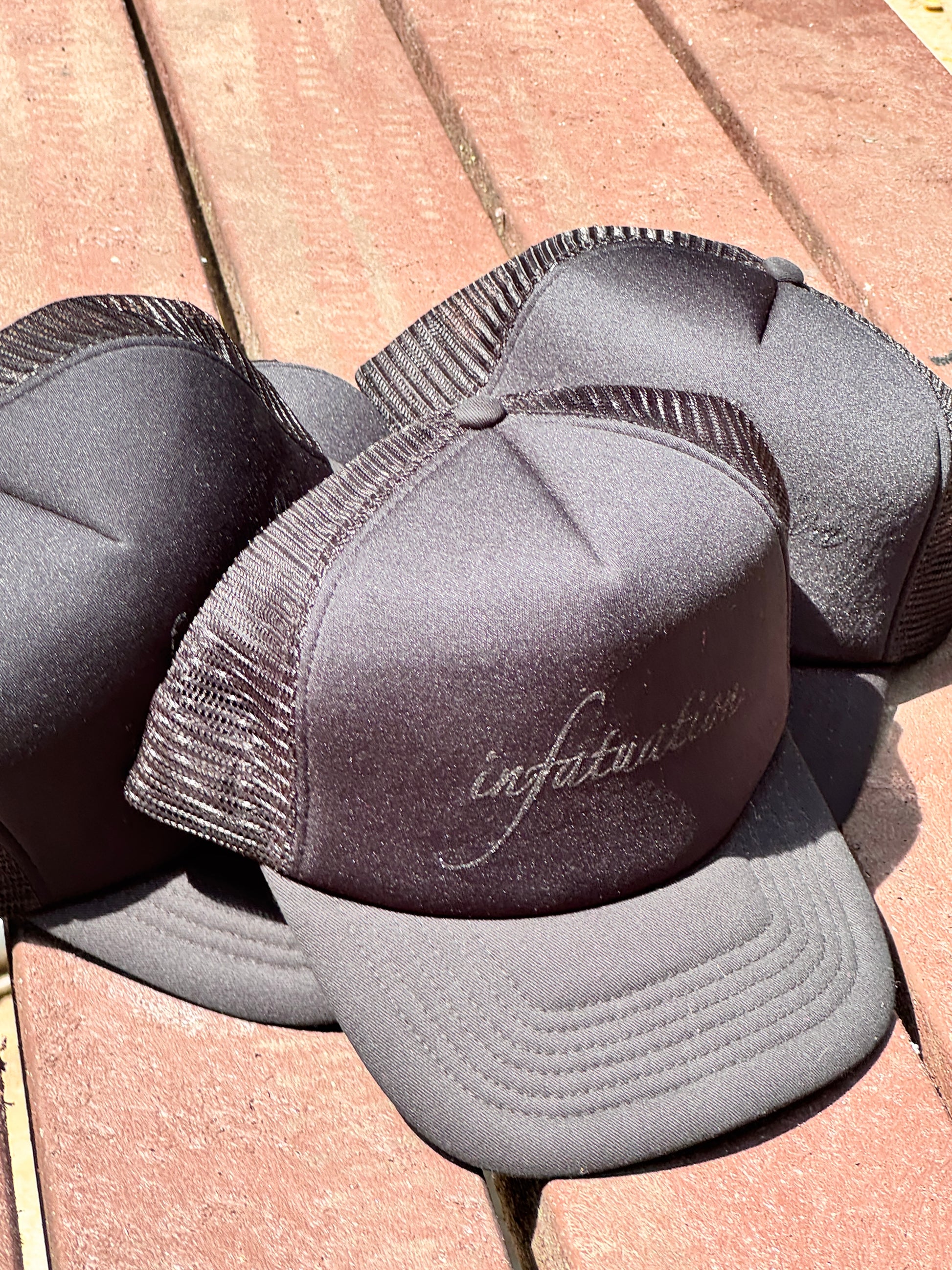 Il Mirage Hat è realizzato in retina total black, con stampa brillantinata nero su nero: un effetto vedo-non-vedo elegante.